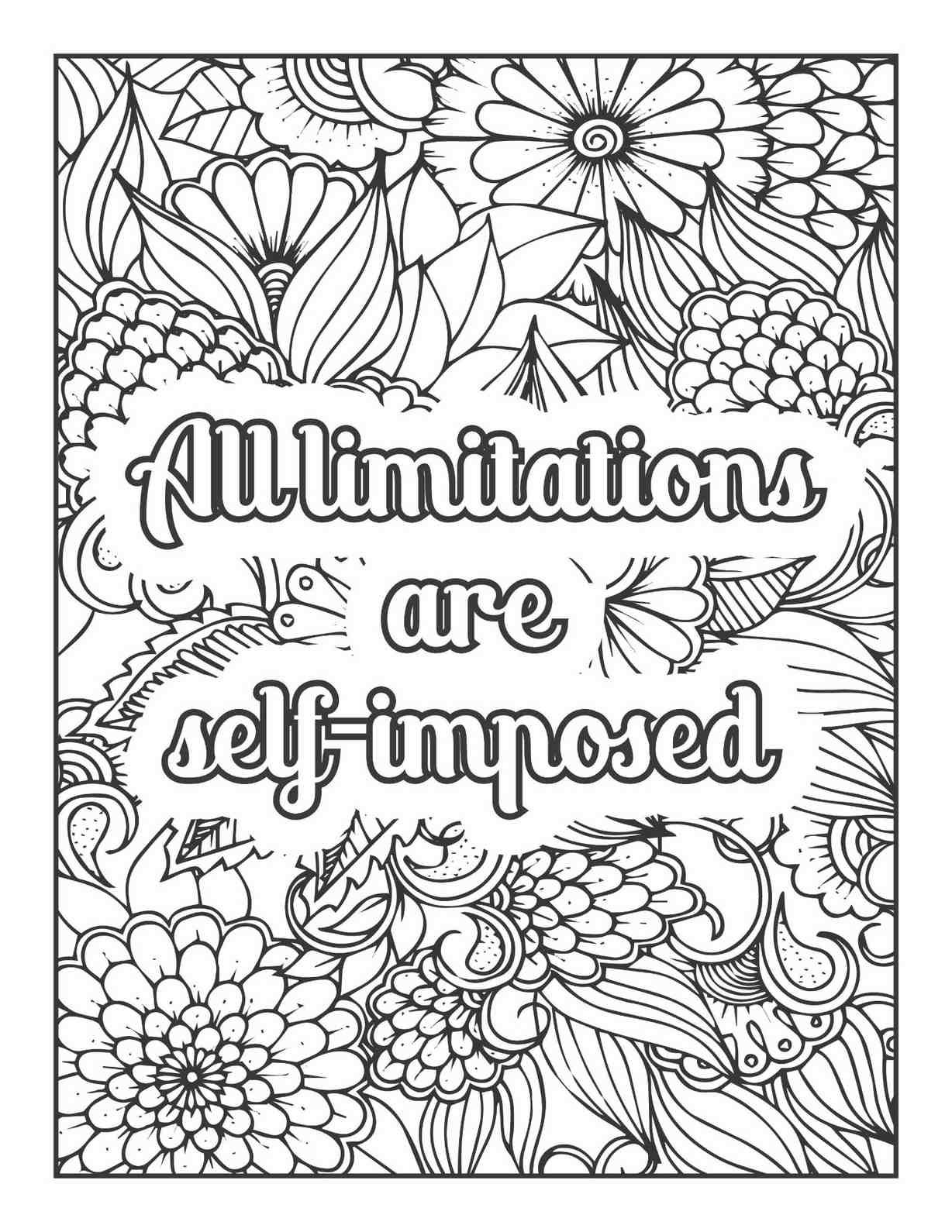 Intricate floral and leaf mandala design with the motivational quote "All limitations are self-imposed" for adult coloring.