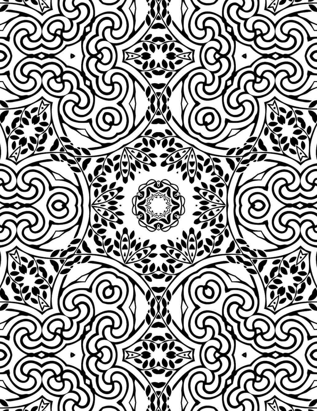 Baroque Botanical Bloom” is an exceptionally rich and intricate mandala, a true celebration of ornate detail and curvilinear grace. This design immediately captivates with its density of interconnected elements, inviting a deep dive into its complex structure. At its core lies a subtly rendered star, serving as a focal point around which an abundance of swirling, almost baroque-like scrolls unfurl. These large, dominant curlicues are meticulously designed, offering broad areas for color and intricate inner pathways. Radiating outwards, the pattern introduces delicate botanical elements: finely detailed leaf clusters that cascade and frame the larger scrolls, adding a naturalistic counterpoint to the ornate flourishes. Smaller, almost diamond-shaped motifs filled with tiny leaves or solid black patterns act as sophisticated connectors, weaving the larger components into a cohesive and visually dense tapestry. The consistent black and white outline emphasizes the sheer volume of detail and the careful balance achieved within such complexity.