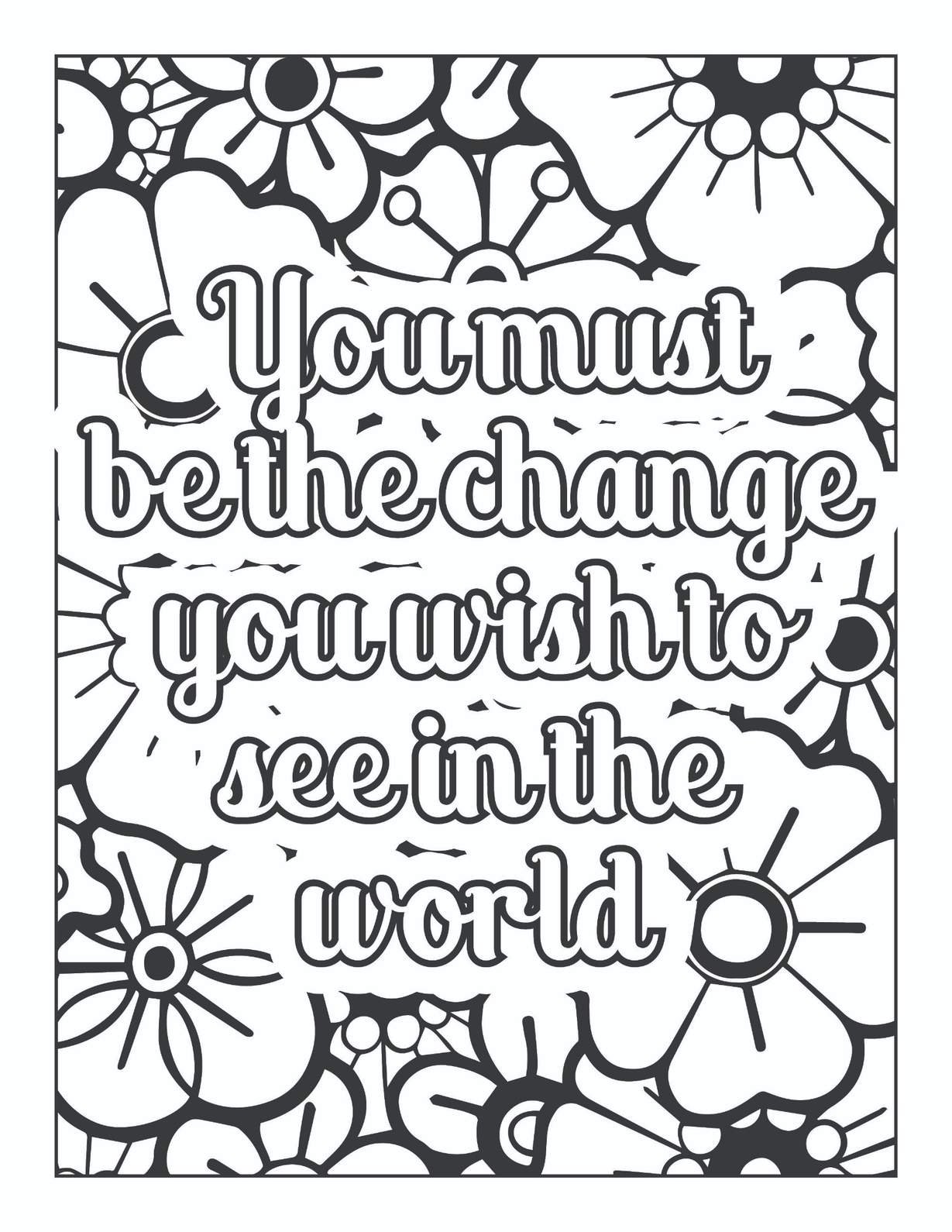 The iconic quote is presented in clear, inviting typography, making it the focal point of the design. Surrounding this transformative message is a vibrant tapestry of bold, stylized floral motifs. Imagine large, distinct flower petals, some adorned with simple concentric circles, others with more intricate details, interspersed with fluid leaf shapes. The simplicity of the outlines allows for both broad strokes of color and more detailed shading, catering to a wide range of artistic preferences. As you meticulously fill each section, you’ll find yourself not only bringing the page to life with color but also reflecting on the personal power you hold to influence your surroundings. This coloring page serves as a visual meditation on personal responsibility and the ripple effect of individual actions.