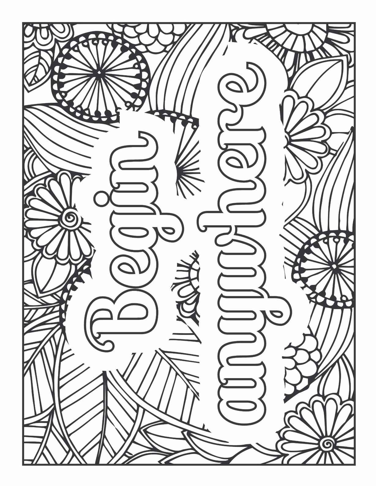 "Free printable adult coloring page with the encouraging quote 'Begin Anywhere' surrounded by intricate floral and leaf patterns, symbolizing new starts and creative freedom."