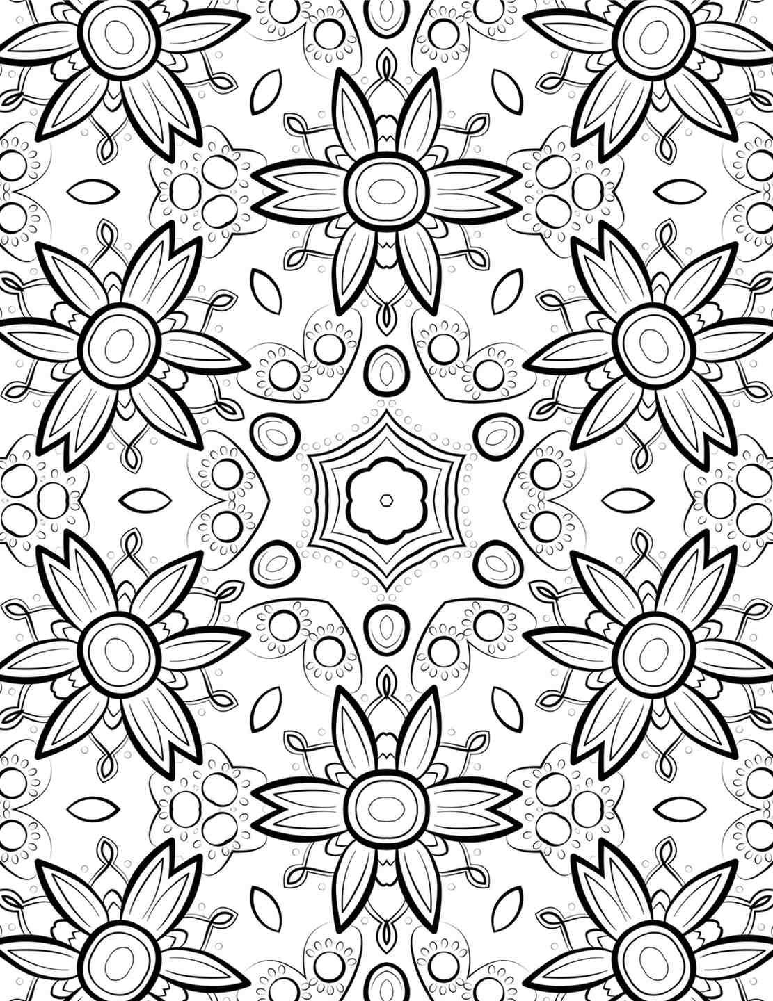 The Blooming Star Mandala unfolds like a garden in full bloom, its design a celebration of circular floral motifs and star-like symmetry. At its core, a hexagonal star radiates outward, encircled by layers of bold, rounded petals that mimic sunflowers in their prime. Delicate leaves and swirling tendrils weave through the pattern, punctuated by clusters of small circles and teardrop shapes that add a playful texture. Crafted in intricate black-and-white line art, this mandala’s lively composition invites a sense of growth and vitality, making it a captivating focus for creative minds.