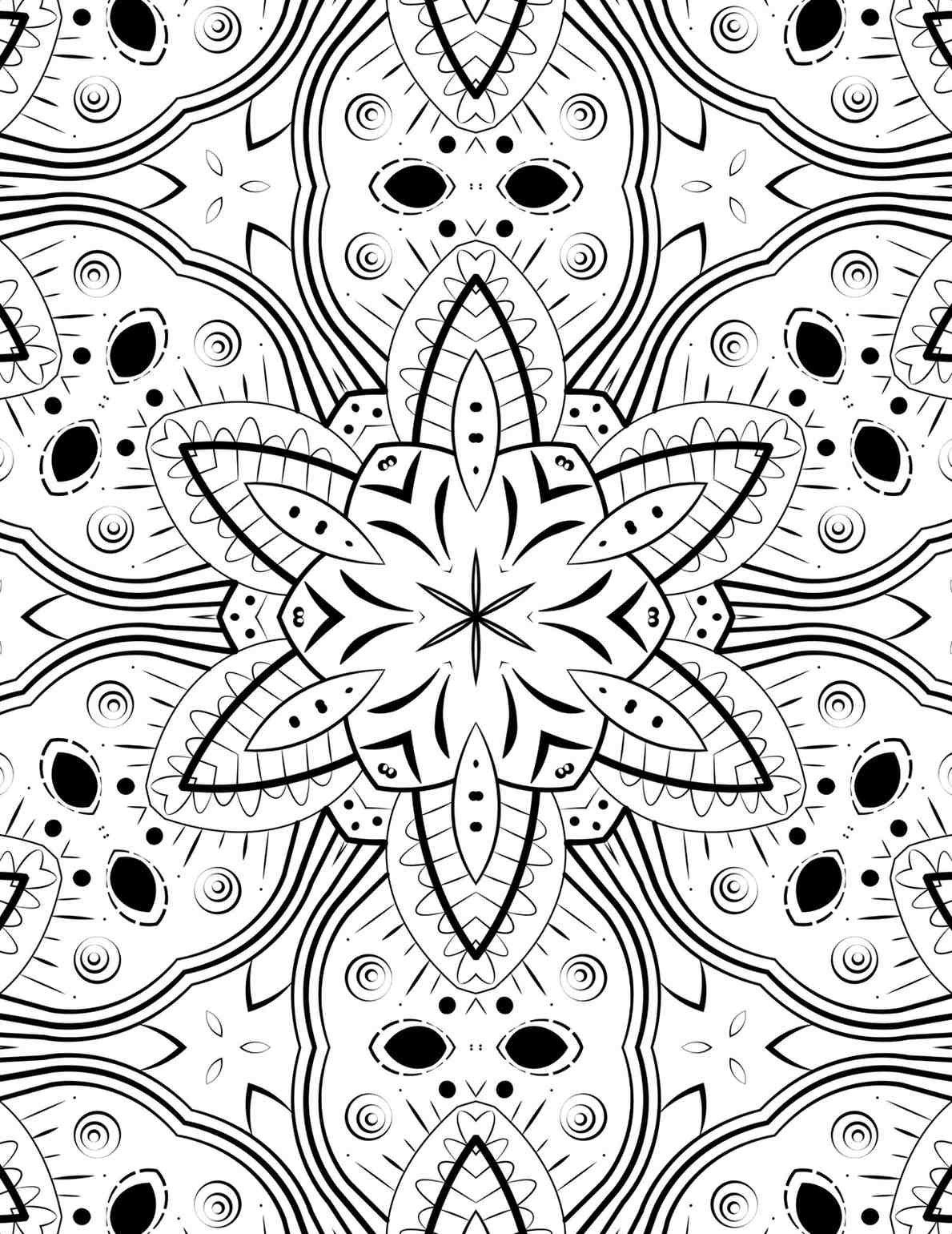 The Spiral Bloom Mandala bursts with dynamic energy, where swirling floral patterns and spiraling lines create a captivating vortex of design. At its core, a star-like center anchors a cascade of petal shapes, each outlined with bold, flowing strokes that twist outward. Interspersed are almond-shaped accents and dotted details, adding texture and depth to the intricate layers. The outer edges feature sweeping curves and rhythmic repetitions, giving the impression of a blooming flower caught in a gentle breeze. Rendered in stark black against a white background, this mandala pulses with movement and natural beauty.