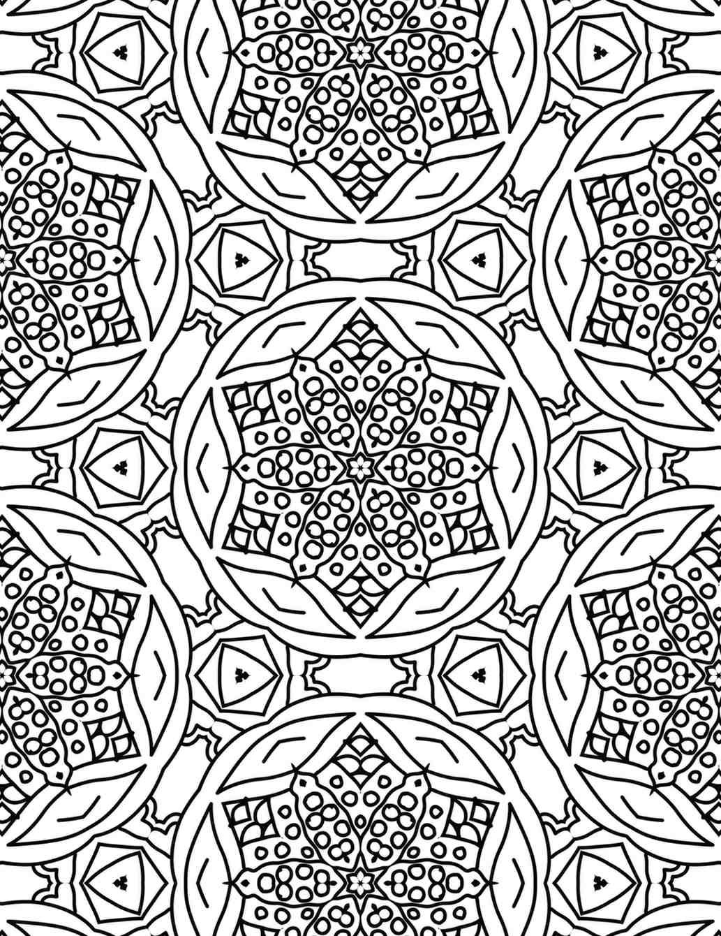 Detailed black and white dot bloom mandala with circular patterns and petal shapes for coloring and meditation