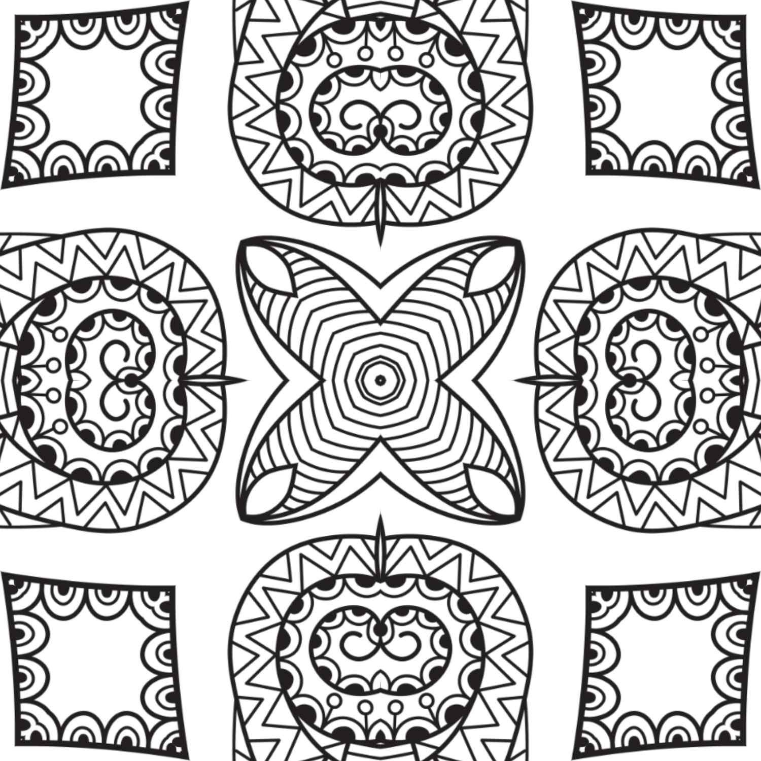 Surrounding this powerful center are four prominent circular sections, each a self-contained medallion of artistry. Within these circles, you’ll discover captivating swirling patterns framed by energetic zigzag borders, giving them a sunburst or ancient amulet aesthetic. These larger forms are beautifully complemented by charming smaller square elements nestled in the corners, adorned with delicate scalloped edges that provide a contrasting touch of grace. The diverse textures and distinct areas within this mandala promise an engaging and rewarding coloring experience. Whether you seek a pathway to mindfulness, a creative outlet for stress relief, or simply a beautiful design to adorn your space, this printable mandala offers an unparalleled opportunity for artistic expression. Download this unique and vibrant medallion mandala today and transform its monochrome lines into a dazzling display of your imagination.