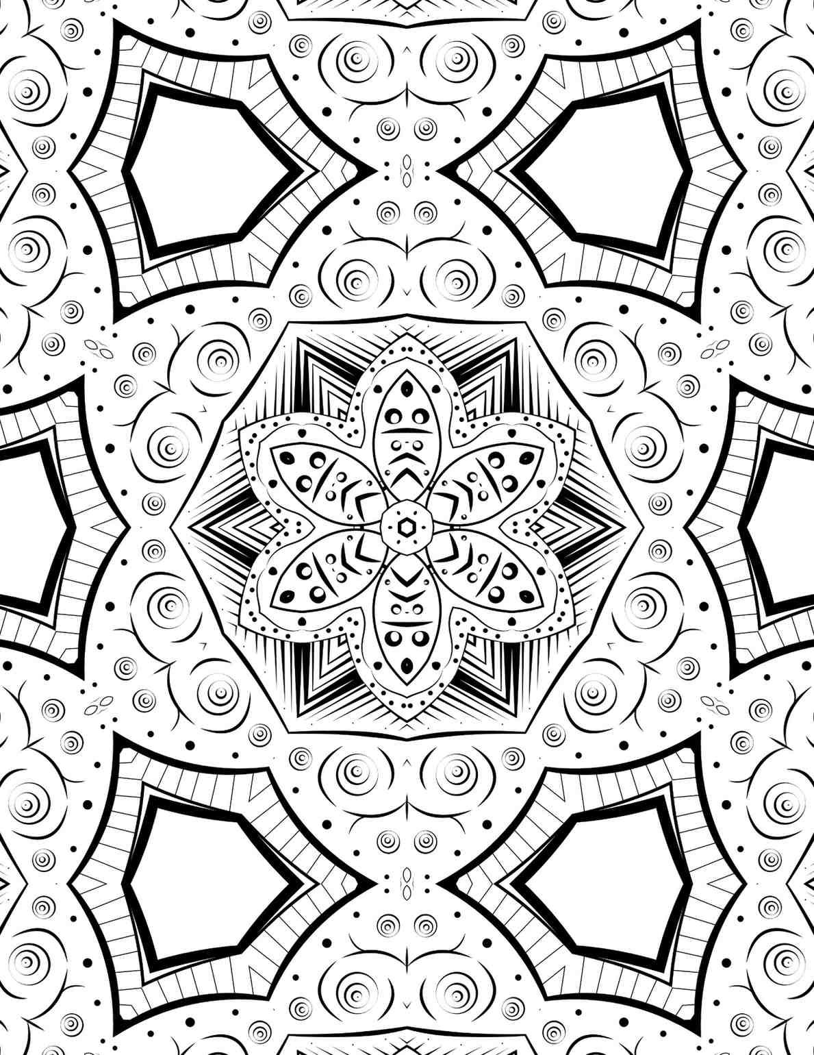 What truly distinguishes this design is the rich tapestry of supporting elements that extend beyond the central focus. Surrounding the main hexagon are larger, bolder pentagonal shapes, acting as strong geometric anchors in the composition. The interplay between these sharp, five-sided forms and the softer, curvilinear lines of the floral patterns creates a fascinating visual dialogue. The background is not merely empty space; it is alive with delicate swirls, tiny concentric circles, and an array of dots, creating a subtle, almost shimmering texture that fills every available space. This meticulous level of detail ensures that each coloring session will reveal new facets of the design, making it a continuous journey of discovery. The overall impression is one of profound balance and spiritual resonance, a visual representation of the universe’s intricate order.