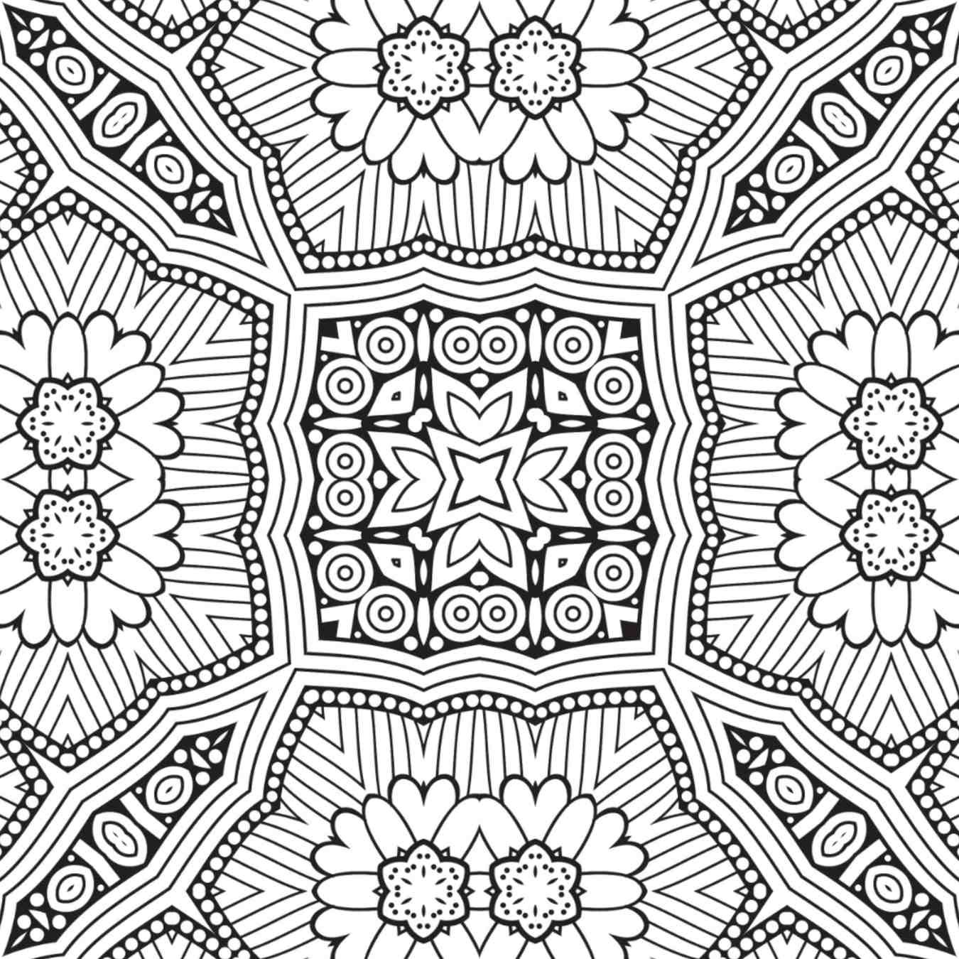Radiating from this central focus are four distinct quadrants, each echoing the floral theme with grace and precision. Large, stylized blossoms, reminiscent of cheerful daisies or intricate lotus flowers, anchor these sections, their petals unfurling with fine, parallel lines that beg for careful shading and vibrant hues. These prominent floral elements are interconnected by elegant bands featuring a repeating geometric pattern of alternating circles and slender rectangles, adding a touch of structured harmony to the organic forms. The interplay between the bold outlines and the intricate internal details creates a satisfying visual texture, promising hours of engaging artistic expression. Every line, every curve, and every small dot has been intentionally placed to guide your hand and eye, transforming the act of coloring into a meditative journey.