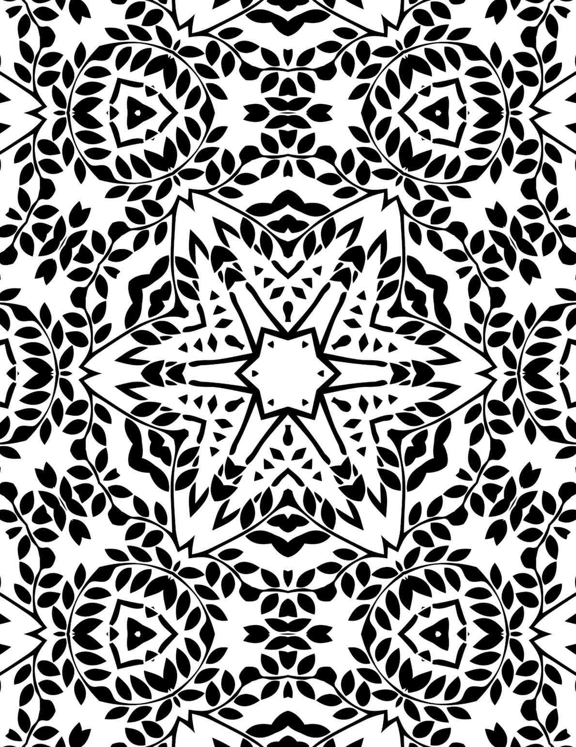 Black and white leaf crown mandala with intricate leafy patterns and star-shaped center for coloring and mindfulness.