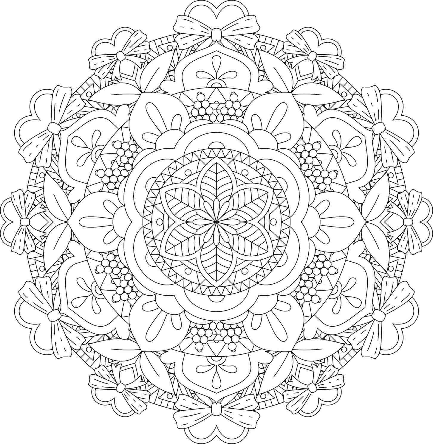 Symmetrical mandala design featuring bows, flowers, and dot patterns, perfect for mindful coloring and creative expression.