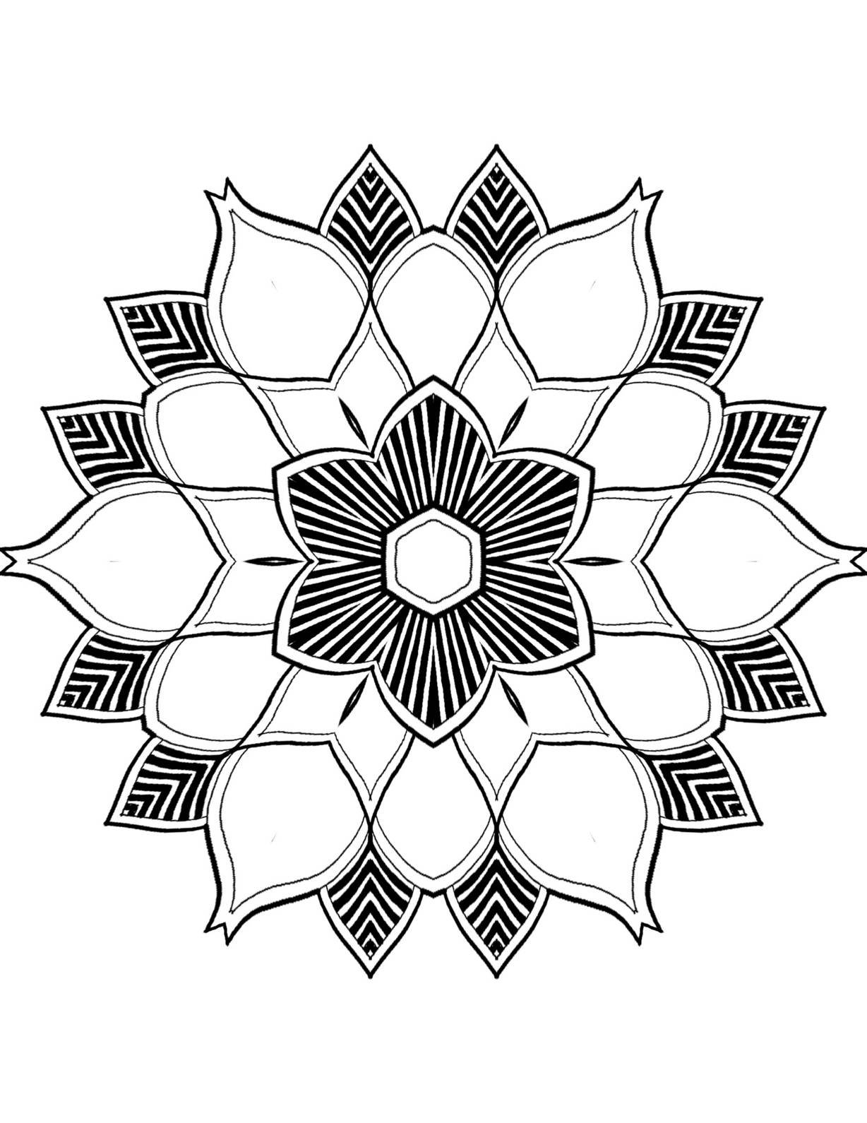 Discover a moment of calm with this elegant Bloom Mandala, now available for complimentary download. This particular design exemplifies graceful simplicity, making it an exquisite choice for anyone seeking a relaxing and accessible coloring experience. At its heart lies a well-defined hexagonal center, from which six prominent petals emerge, each filled with radiating lines that draw the eye outwards. These central petals are then encircled by a larger layer of soft, rounded petal shapes, some of which are adorned with striking chevron patterns that add a subtle dynamism to the overall composition. The balance between the unadorned spaces and the patterned sections offers a delightful interplay, inviting various coloring approaches.