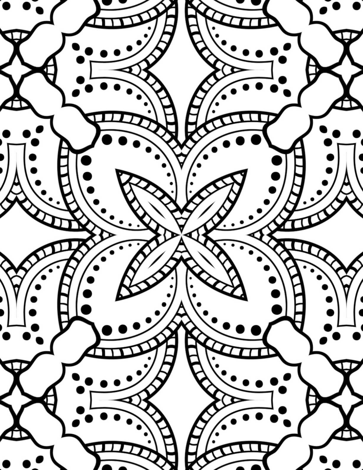 Surrounding this starburst heart, the design branches into broader, petal-like forms that are themselves filled with a fascinating array of smaller motifs. You’ll discover repeating elements of nested curves, tiny circles, and additional dotted lines that weave together like an opulent tapestry. The outer periphery of the mandala features a distinctive border composed of repeating “U” shapes, each capped with a delicate circular detail, providing a beautiful frame for the intricate spectacle within. The balance of bold outlines and a multitude of tiny spaces offers a rich playground for colorists, allowing for intricate shading, precise color placement, and a truly rewarding artistic process. This design, while complex, maintains a harmonious symmetry that guides the eye naturally through its many layers.
