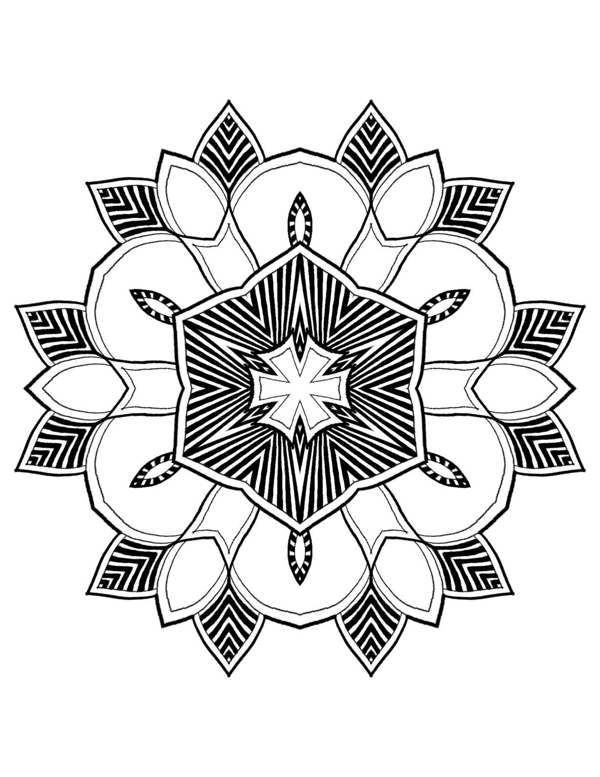 Uncover a captivating design with this Geometric Radiance Mandala, readily available for your complimentary download. This striking piece draws the eye inward with its powerful central motif: a prominent six-pointed star shape, densely filled with a mesmerizing array of radiating lines that converge at its heart. This central energy core is surrounded by an outer ring of gracefully flowing leaf-like forms, some of which are left open, while others feature elegant chevron patterns, adding a dynamic contrast to the overall composition. The interplay between the solid, bold central element and the more fluid, organic outer shapes creates a unique visual tension that is both engaging and harmonious.