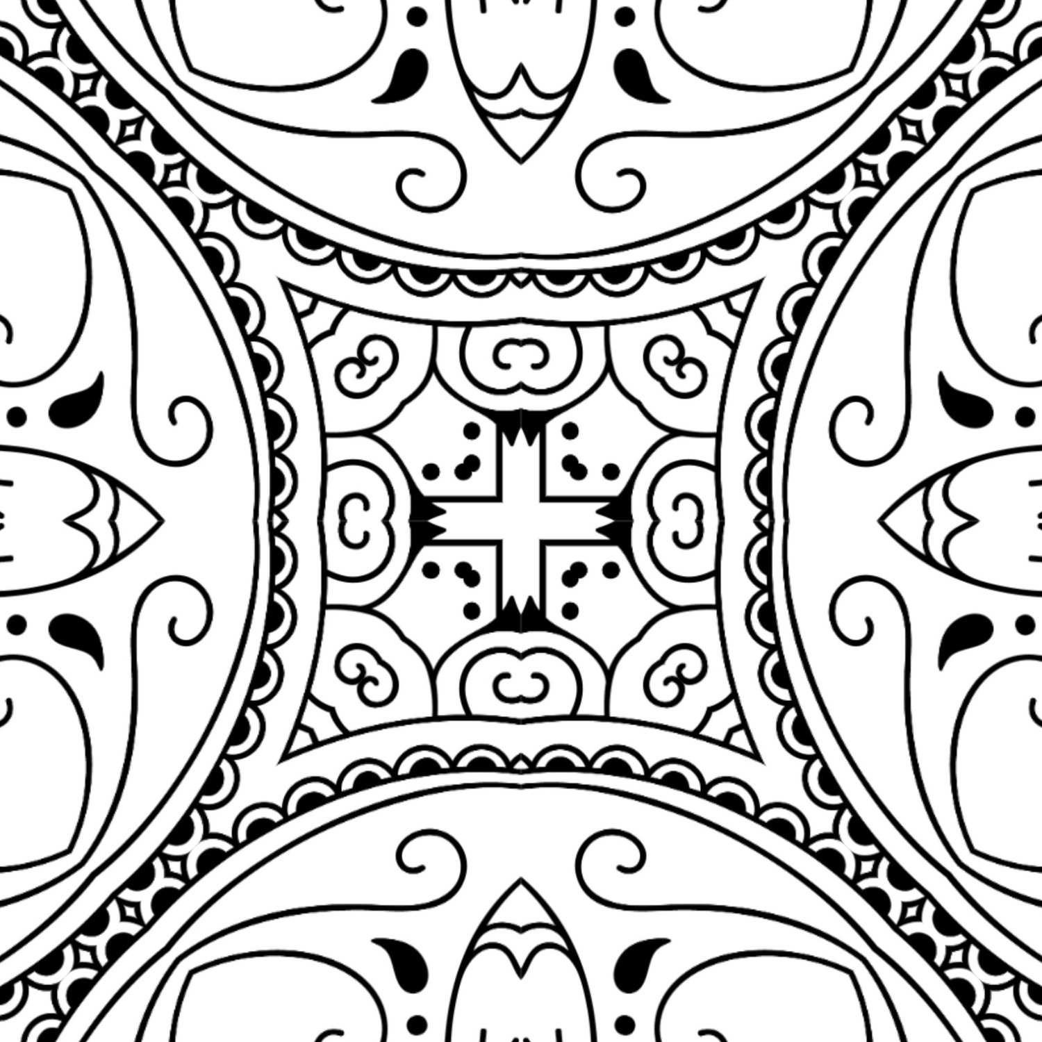 Dive into a world where precision meets fluidity with our captivating “Geometric Flow Mandala,” a design that offers a truly unique visual experience. At the very heart of this intriguing pattern lies a strong, distinct square, containing a symbolic cross-like motif surrounded by delicate dots, acting as a powerful central anchor. From this core, the design gracefully expands outwards, featuring a series of undulating curves and rounded forms that create a sense of harmonious movement. Each of the four main quadrants showcases elegant, almost droplet-shaped elements, beautifully adorned with subtle internal lines and characteristic patterns. These larger shapes are expertly framed by rich, scalloped borders and intricate detailing along the edges, reminiscent of traditional textile art or ornate carvings. The masterful interplay of straight lines, crisp corners, and soft, flowing curves creates a dynamic tension that keeps the eye engaged, inviting a meditative exploration of its every facet. This mandala truly distinguishes itself with its thoughtful balance of structure and organic appeal, offering ample opportunities for both broad color washes and intricate detailing.