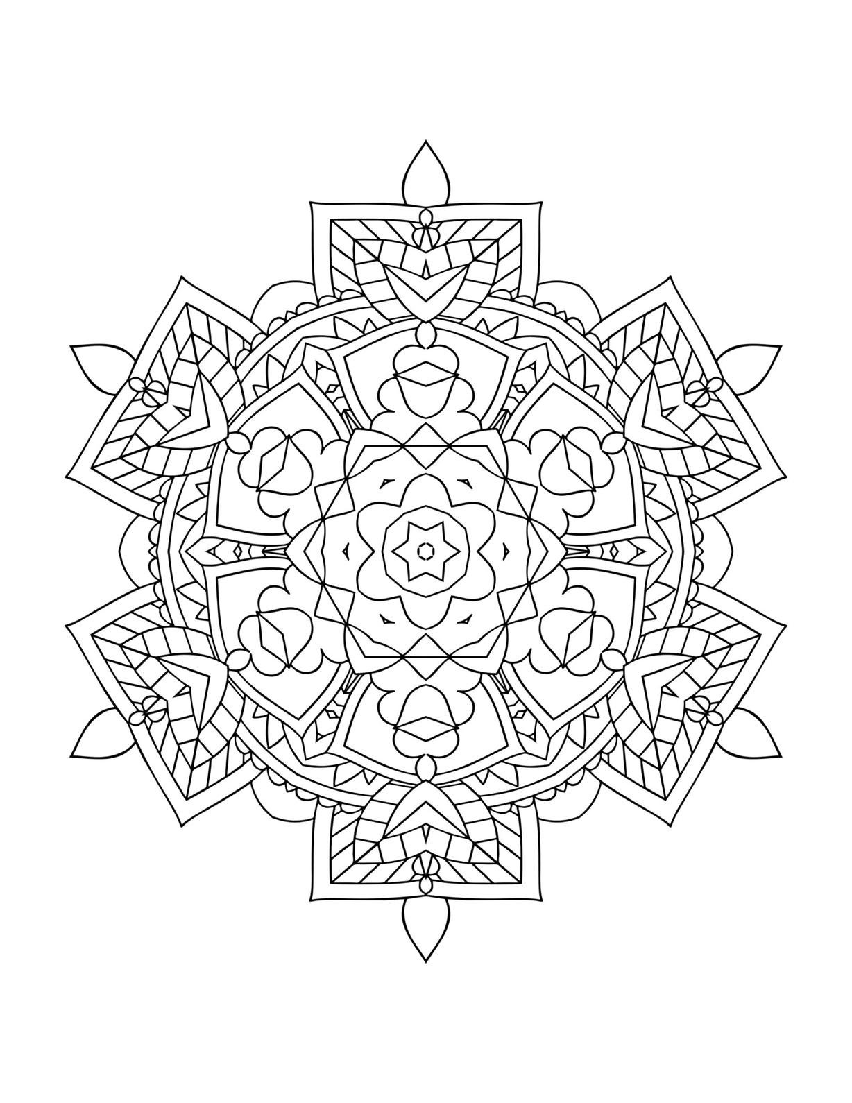 This mandala’s clear outlines and varied shapes make it an excellent choice for colorists of all skill levels. Beginners will appreciate the distinct sections, while more experienced artists can explore the nuances of shading and color blending within both the geometric and floral elements. Engaging with this design naturally promotes a state of mindfulness, helping to quiet the mind and reduce everyday stress. The balanced composition and repetitive nature of the patterns foster a sense of calm and focus, making the act of coloring a truly therapeutic experience. Imagine bringing this harmonious design to life with a palette of soothing blues and greens to emphasize its tranquility, or perhaps a vibrant array of contrasting colors to highlight the interplay of shapes. Download this Geometric Harmony Mandala today and allow its balanced energy to guide you towards a moment of peaceful creativity and inner equilibrium.