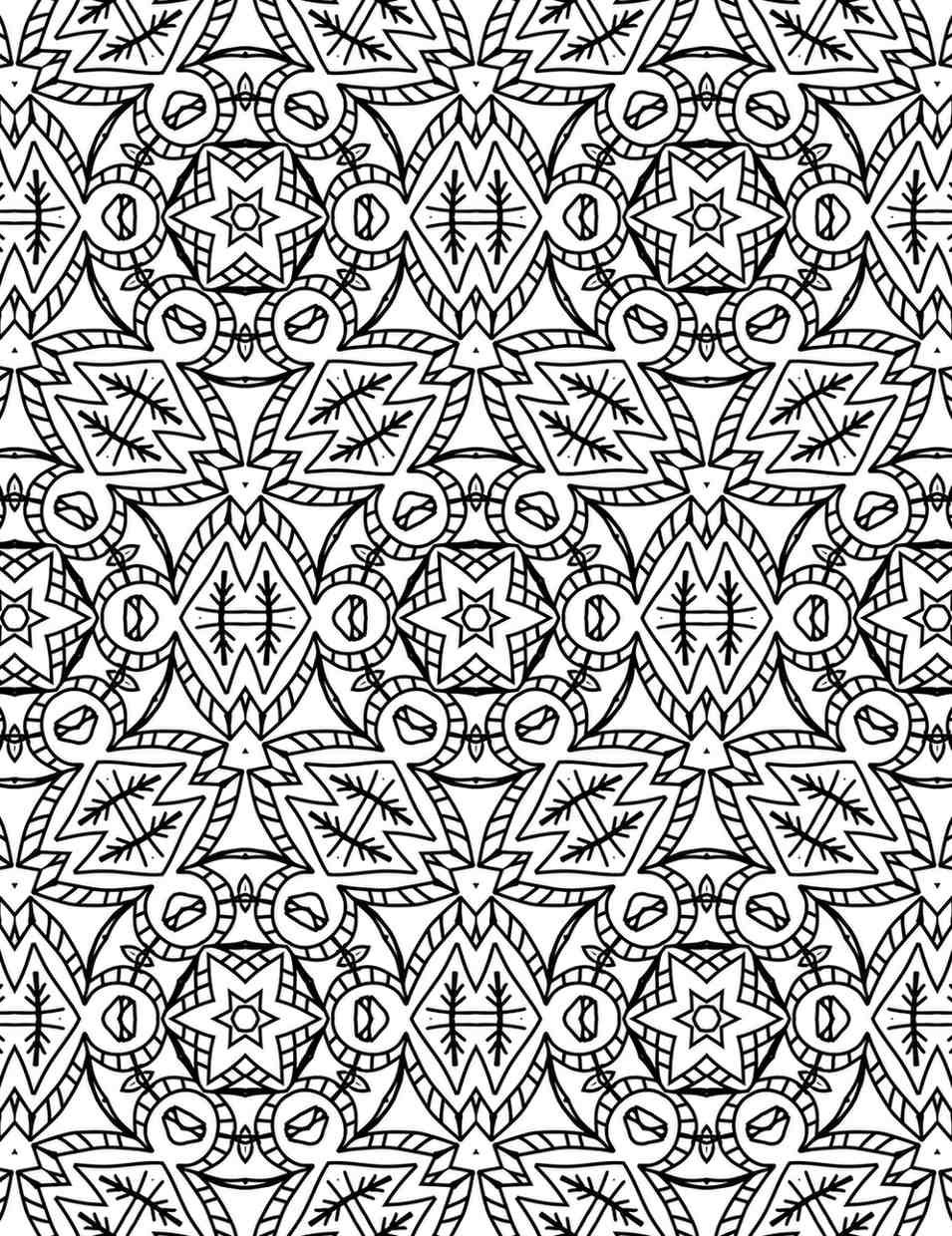 Immerse yourself in the captivating precision of this extraordinary mandala design, a profound testament to the power of intricate geometry and repeating forms. This particular piece immediately draws the eye with its robust, tessellated structure, where each segment seamlessly interlocks with the next, creating an endless, almost woven tapestry of detail. At its heart, the design features prominent, multi-layered star shapes nestled within larger diamond-like rhomboids. These foundational elements are then meticulously adorned with smaller, tribal-inspired patterns, including stylized leaves or branches that add an organic touch to the otherwise angular composition. Smaller circular accents and precise triangular segments fill the interstitial spaces, ensuring every inch of this complex design is rich with visual interest. The density of the pattern and the clarity of its lines promise an engaging and deeply satisfying coloring experience, inviting a contemplative journey through its numerous small sections.