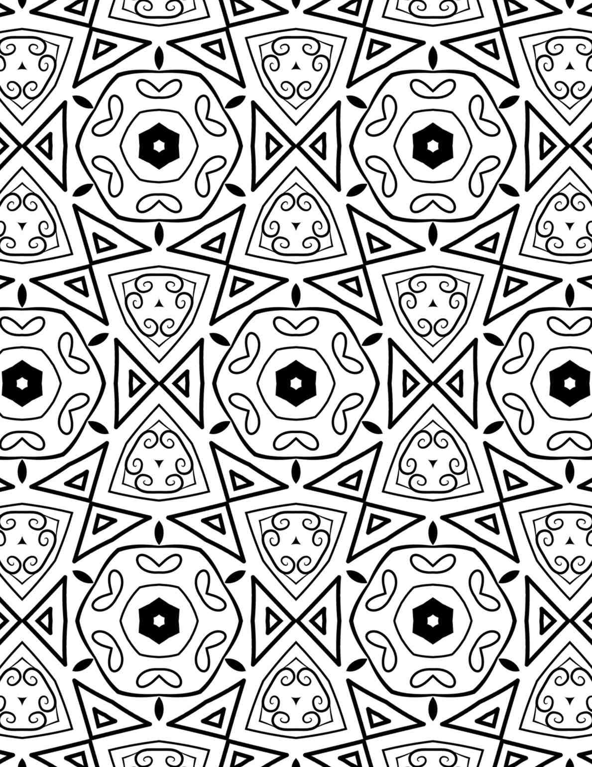 This mandala presents a fascinating visual puzzle, built upon a repeating framework of robust hexagonal shapes. Each prominent hexagon anchors the design, featuring a striking solid black core that draws the eye and grounds the pattern. Radiating outwards from these central hexagons are elegant, almost heart-shaped or teardrop-like swirling motifs, adding a graceful fluidity to the overall structure. These hexagonal units are masterfully connected by sharp, star-like triangles, their points creating a dynamic tension that beautifully contrasts with the softer curves. Nestled within these triangular connections are smaller, intricately scrolled patterns, resembling delicate tendrils or ancient filigree. The entire composition forms a seamless, tessellating tapestry, where bold geometric outlines meet delicate organic detailing, creating a rhythm that is both structured and free-flowing.