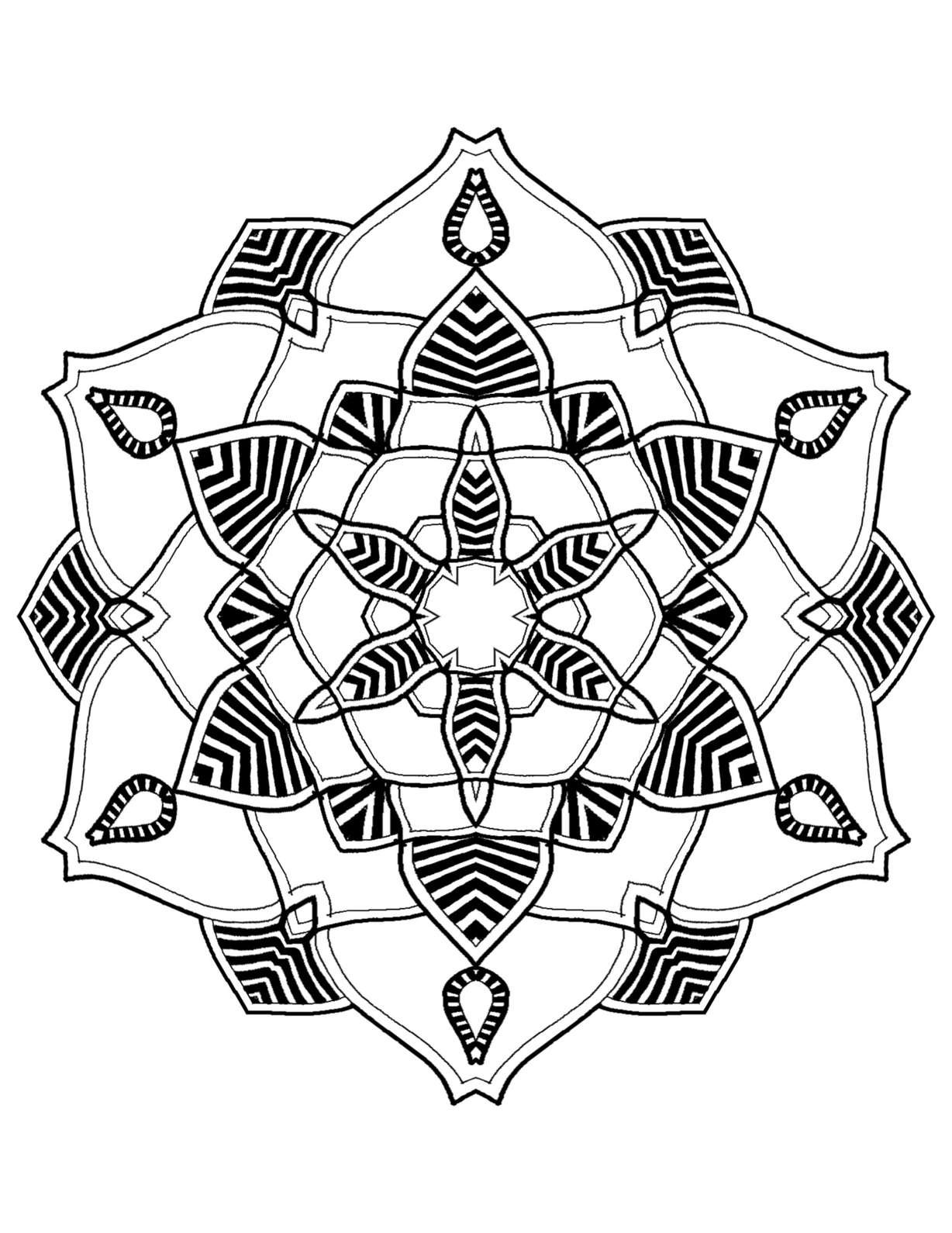 Embark on a captivating artistic journey with this stunning Intricate Petal & Teardrop Mandala, now available for free and instant download. This design is a masterclass in symmetrical complexity, drawing the eye into a beautiful dance of repeating patterns and organic forms. At its very heart, a delicate star-like structure emerges, acting as the energetic core. From this center, a series of bold, triangular petals unfurl, each densely packed with dynamic chevron lines that create a mesmerizing visual ripple. Surrounding this intricate core, a layer of softer, more elongated petal shapes appear, some left open, inviting expansive color, while others are subtly adorned with delicate teardrop or eye-like motifs, adding a touch of elegant detail. The outermost layer further expands on this theme, showcasing broader, stylized petals, some featuring prominent chevron patterns, while others are left plain, culminating in a rich and layered composition.