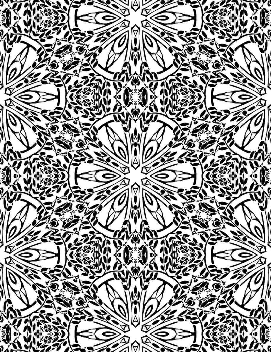Dense black and white kaleidoscopic mandala pattern with intricate leaves and floral shapes