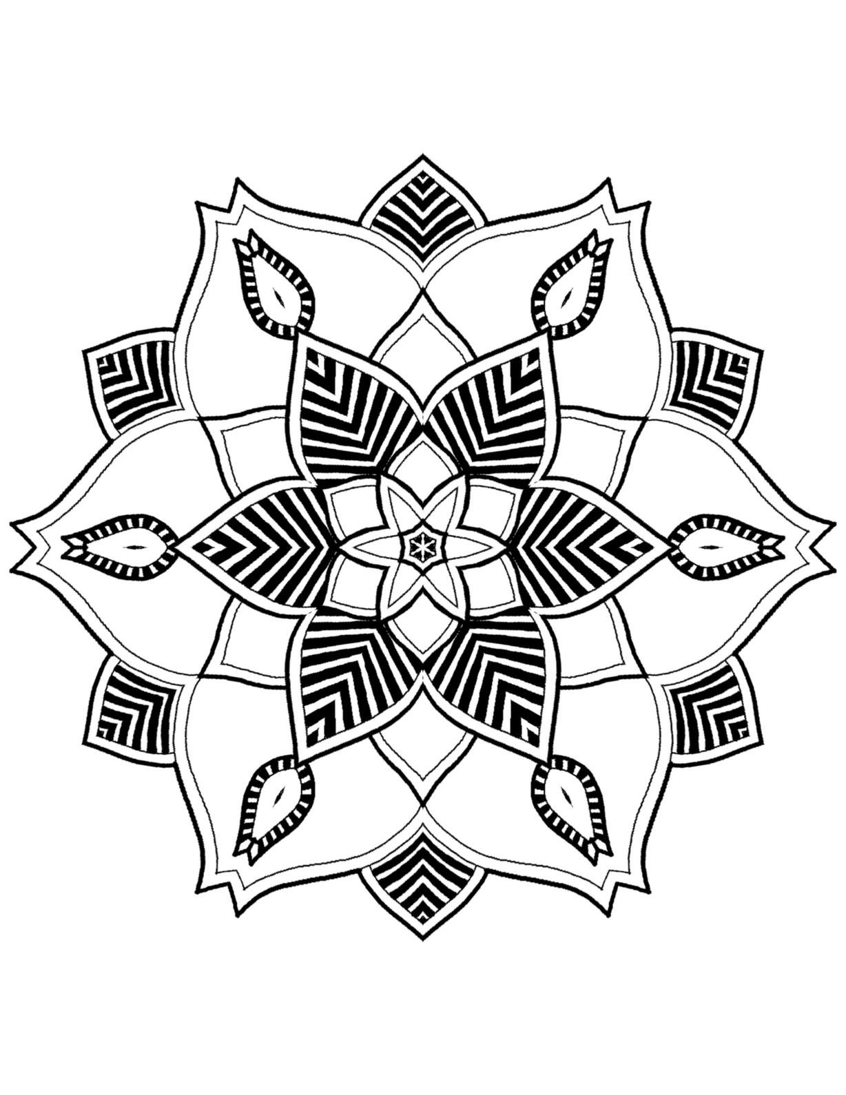 Step into a world of serene creativity with this captivating Layered Bloom Mandala, now offered for free download. This design unfolds like a blossoming flower, presenting a delightful interplay of organized geometry and graceful curves. At its core, a charming small star-like shape is nestled, acting as the central anchor from which the entire composition expands. Surrounding this heart, six prominent petal shapes emerge, each generously filled with bold, dynamic chevron patterns that create a compelling visual rhythm. Beyond these, another layer of broader, more rounded petal forms encircles the inner structure. These outer petals feature charming, almond-shaped inserts, some filled with subtle lines, others left open to invite your artistic touch. The outermost edge of the mandala is defined by further stylized petal or leaf shapes, some displaying bold, parallel lines, providing a satisfying frame to the intricate core.
