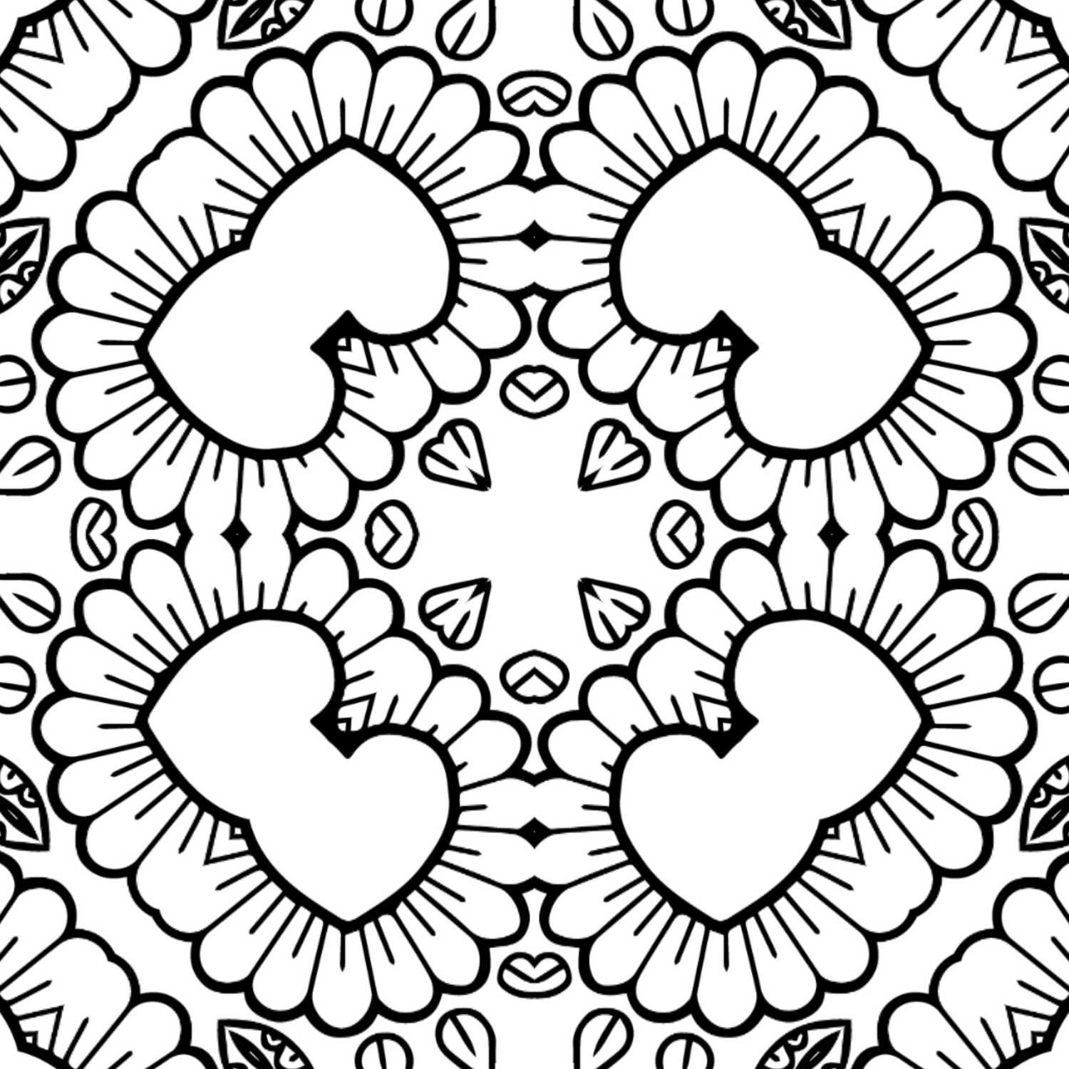 Surrounding these central hearts, the design gracefully unfolds with layers of delicate, petal-like forms that echo the organic flow of nature. These softer elements frame the hearts beautifully, creating a harmonious balance between defined shapes and fluid lines. The very center of the mandala is open and inviting, featuring smaller, simpler motifs that act as a gentle starting point, leading your eye and your coloring tools into the larger, more expressive sections. The overall composition is one of comforting symmetry, making it both easy to engage with and deeply satisfying to complete.