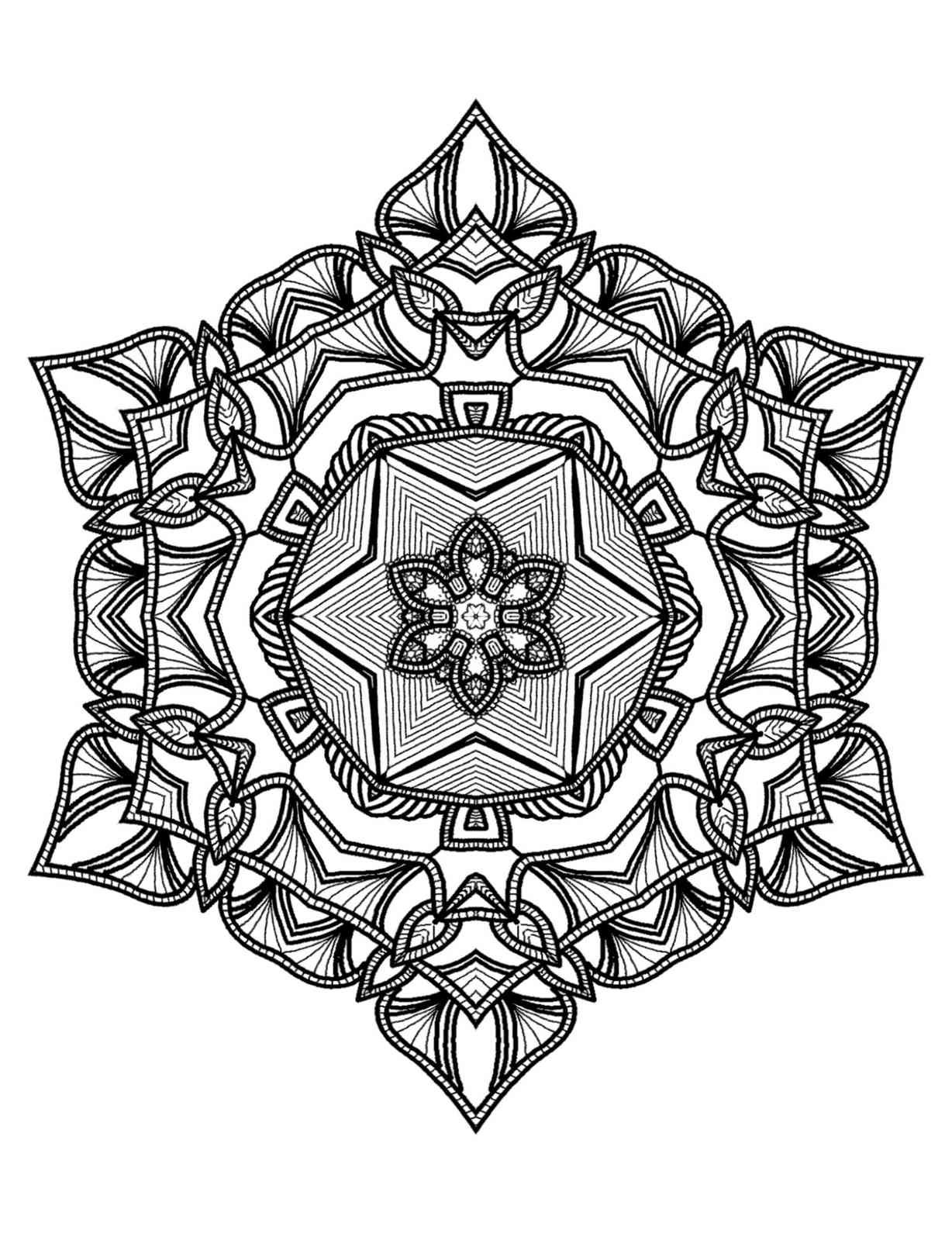 Highly intricate symmetrical mandala with a prominent central star, layered geometric patterns, and fine linear details, black and white design for advanced adult coloring.