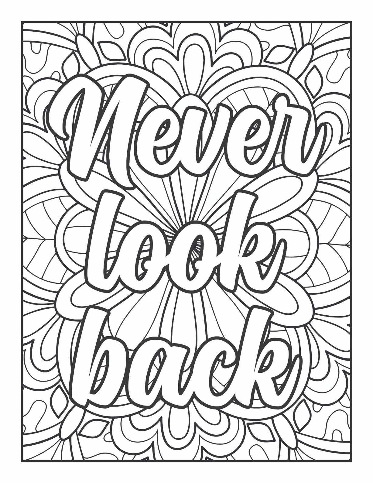 This powerful mandala isn’t just a design to color; it’s a profound statement and a tool for introspection, urging you to embrace the path ahead. The central phrase, “Never Look Back,” is rendered in a flowing, confident script that immediately catches the eye, serving as a constant reminder to release the past and focus on what lies before you. Surrounding this strong message is a backdrop of intricate floral and swirling patterns, radiating outwards, symbolizing growth, expansion, and the continuous unfolding of life.
