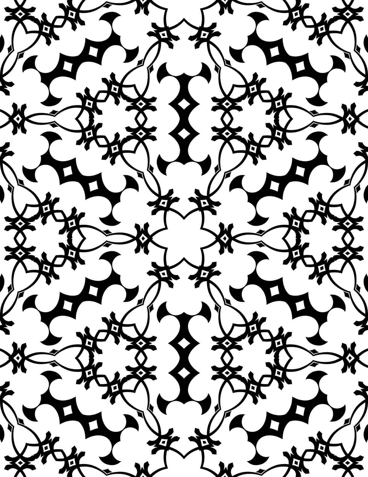 Black and white mandala design featuring interwoven diamond shapes, curved cross-like motifs, and ornate symmetrical connectors