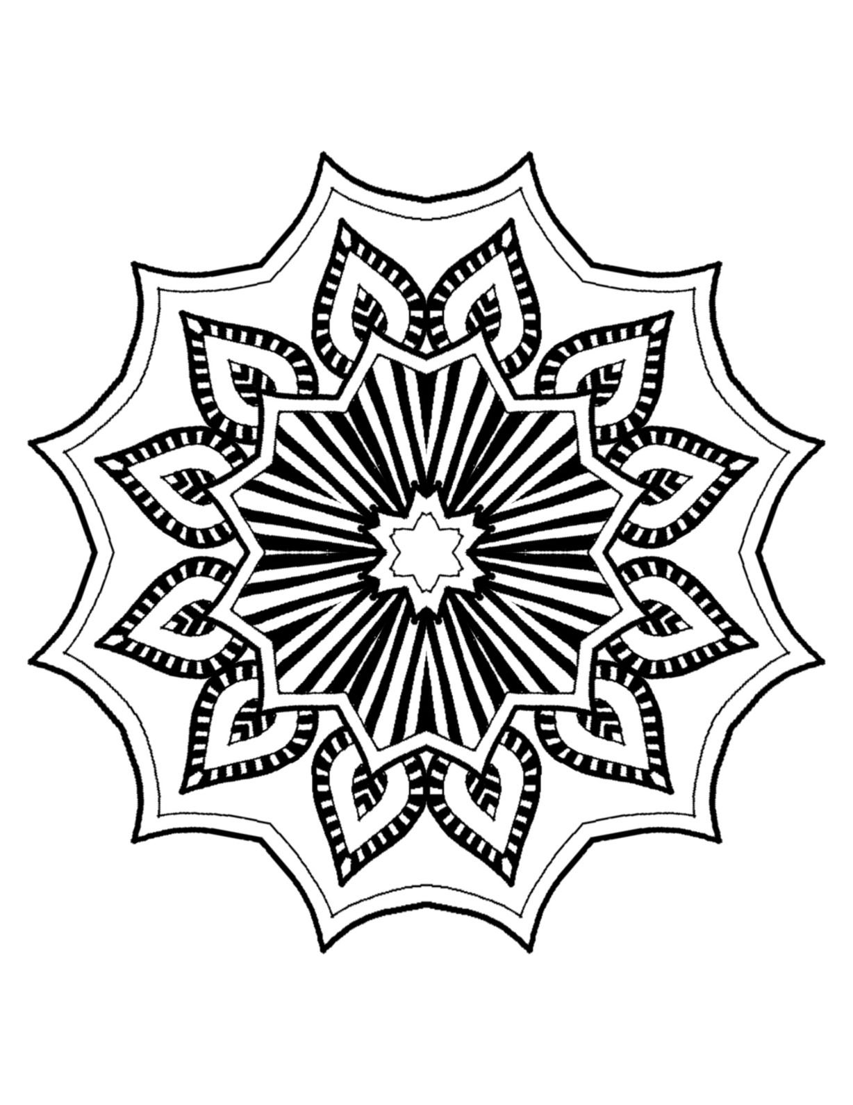 Symmetrical black and white mandala featuring a central starburst design with prominent radiating stripes and layered pointed petals for coloring. Perfect for a mindful activity