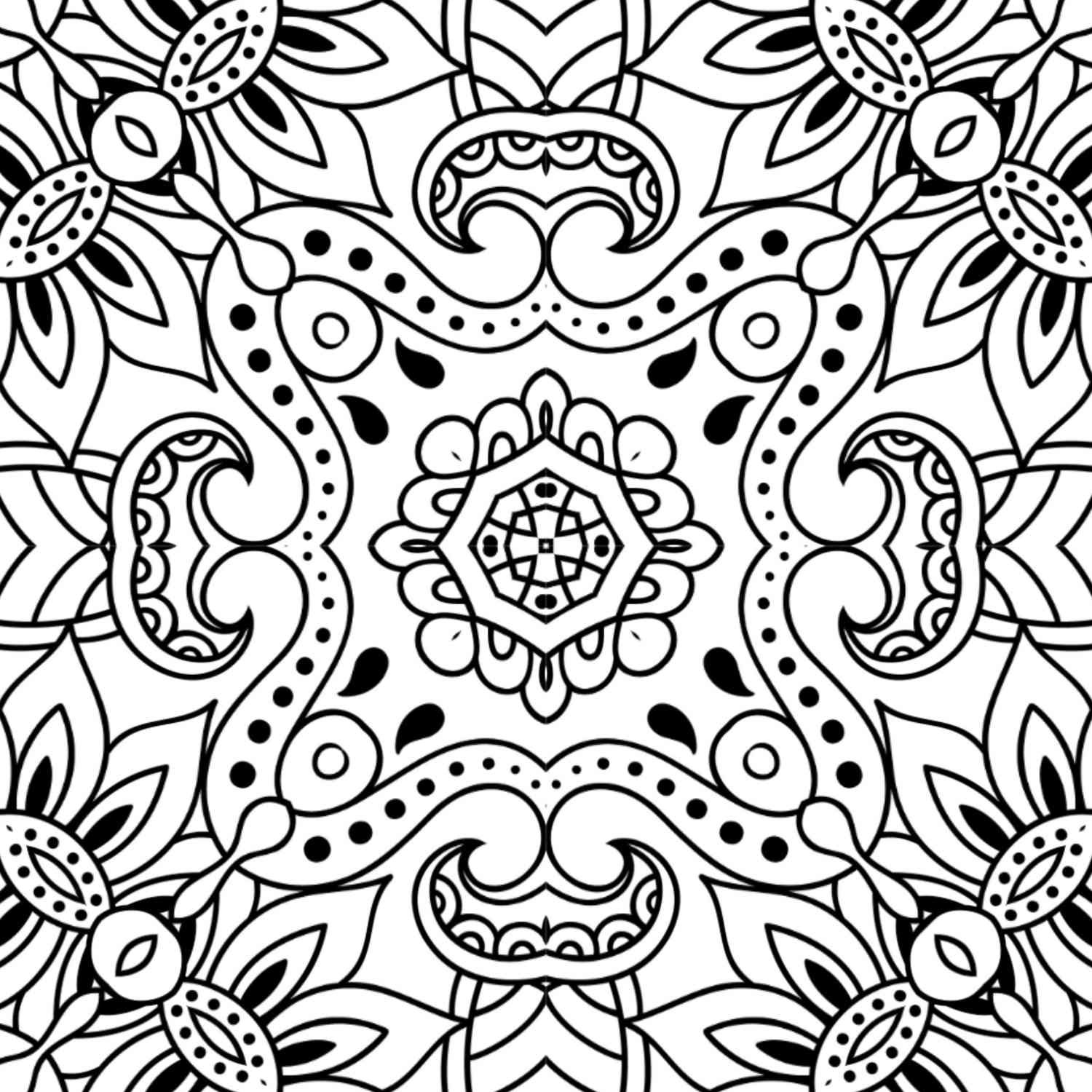 Immerse yourself in the graceful dance of lines and dots with our enchanting “Serene Swirl Mandala,” a design that radiates a calming sense of organic movement and intricate beauty. At its very core, this captivating square mandala features a beautifully detailed central element, a multi-faceted motif that serves as a focal point, drawing the eye into its depths. Radiating outwards, four prominent, almost tear-drop or paisley-like shapes gracefully expand, their contours defined by delicate dotted lines that add a unique softness to the composition. These flowing forms are interspersed with smaller, intricate swirls and precise clusters of dots, creating a rich tapestry of textures and patterns. The outer quadrants and corners of the mandala are adorned with a harmonious blend of stylized floral clusters and elegant curves, all meticulously outlined. The design skillfully combines open, sweeping sections that invite broad washes of color with intricate, detailed areas that promise a rewarding experience for fine-tipped pens. This mandala truly stands out for its flowing aesthetic and soothing rhythm, making every coloring stroke a moment of peace.