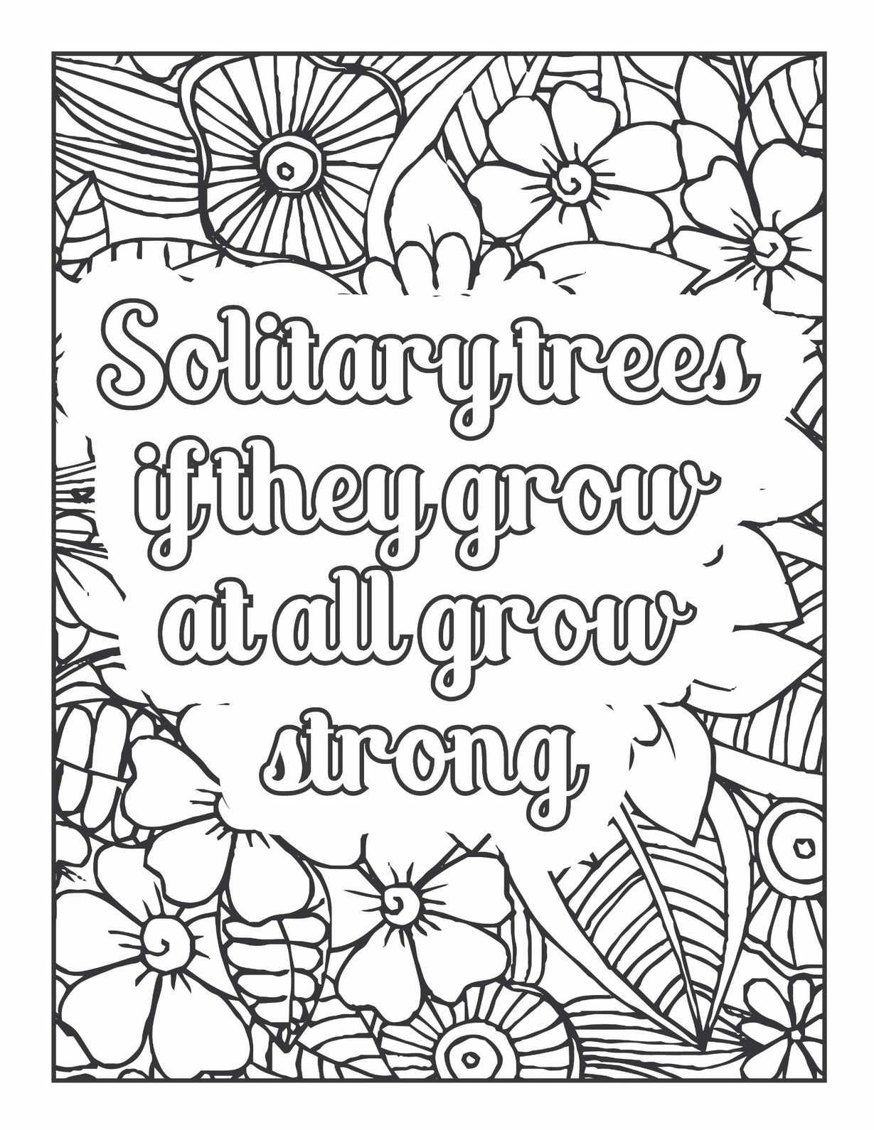 "Inspirational quote coloring page with floral border, 'Solitary trees if they grow at all grow strong,' perfect for mindfulness and self-reflection"