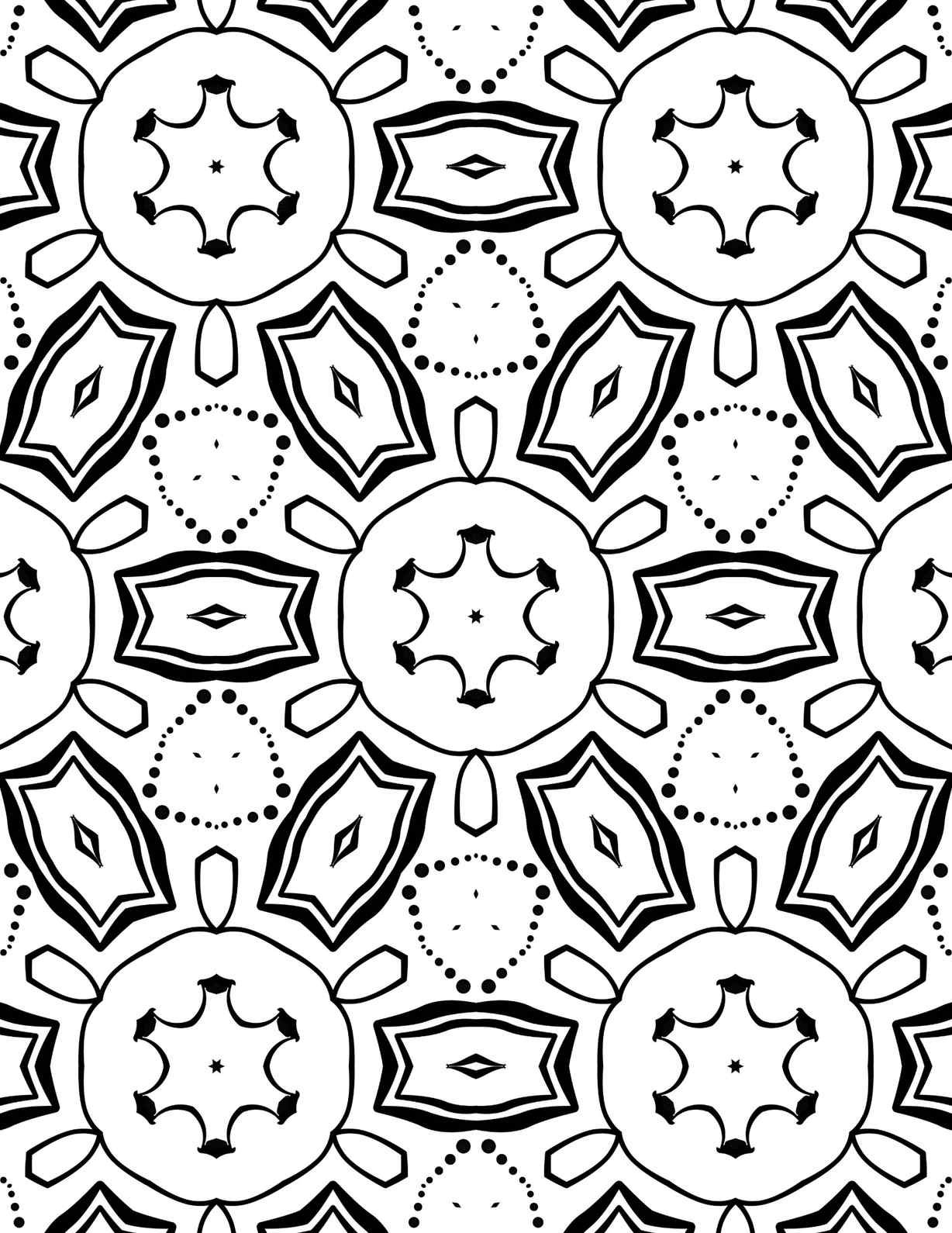 The Crystalline Star Mandala gleams with a design that evokes the shimmer of a gemstone. At its core, hexagonal shapes form star-like centers, each outlined with precision and adorned with tiny floral accents. Diamond-shaped petals radiate outward, framed by delicate dotted edges that enhance the pattern’s sparkling effect. The stark black-and-white contrast amplifies its geometric beauty, creating a mosaic that feels both structured and alive. This mandala’s intricate layers invite you to explore, offering a perfect blend of focus and creative inspiration.