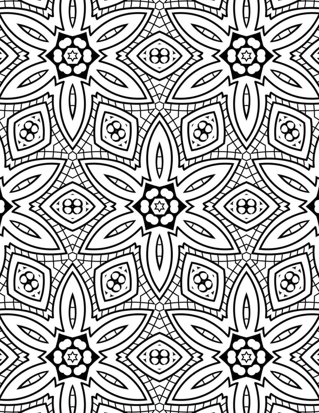 Detailed stained glass bloom mandala with six-petal flowers, inner stars, and intricate diamond shapes with figure-eight motifs for mindful coloring.