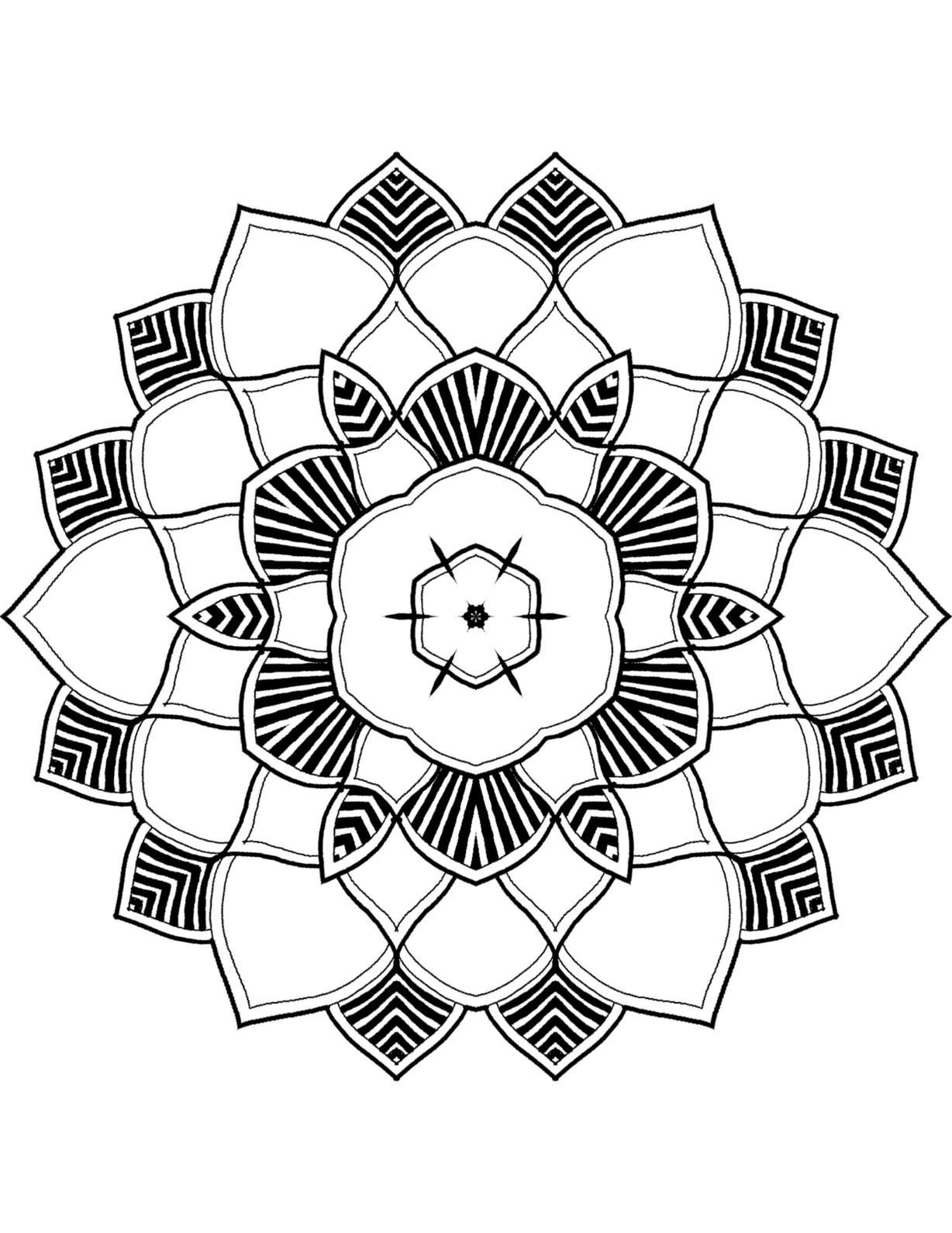 Easy symmetrical flower mandala with patterned and plain petals, black and white outline for stress relief