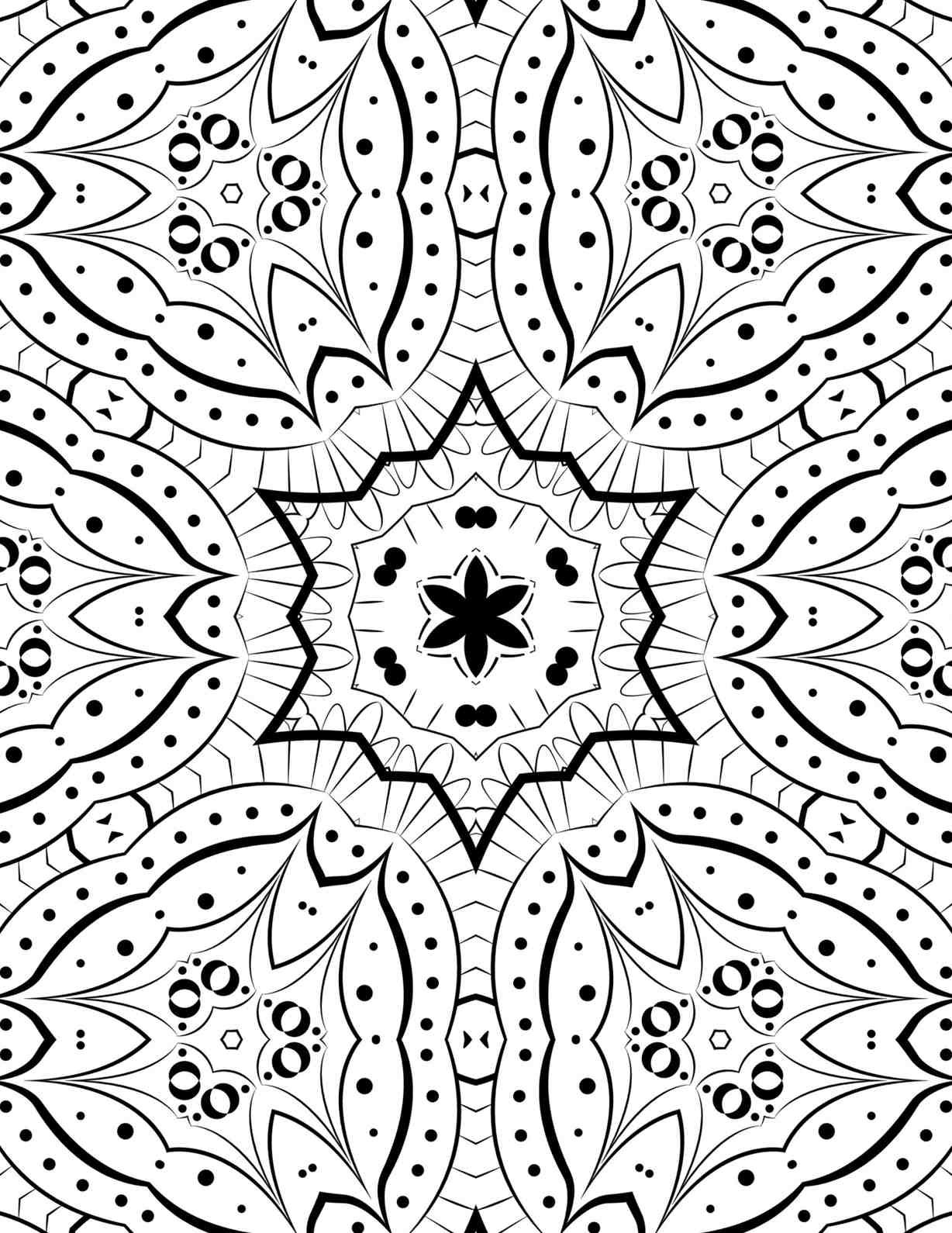 Immerse yourself in the captivating layers of this ‘Serene Bloom’ mandala, a design that elegantly marries floral inspiration with structured geometry. At its very heart lies a distinct, dark floral motif, a focal point that draws the eye into the intricate dance of patterns around it. This central bloom is cradled within a multi-pointed star, from which a symphony of finely detailed petals and teardrop shapes unfold. What truly distinguishes this mandala is the rich “texture” created by an abundance of dots, strategically placed within various segments, giving the impression of delicate beadwork or sparkling dew drops. The interplay of bold outlines and nuanced interior details ensures a deeply engaging experience, inviting you to explore its depths with every stroke of color.