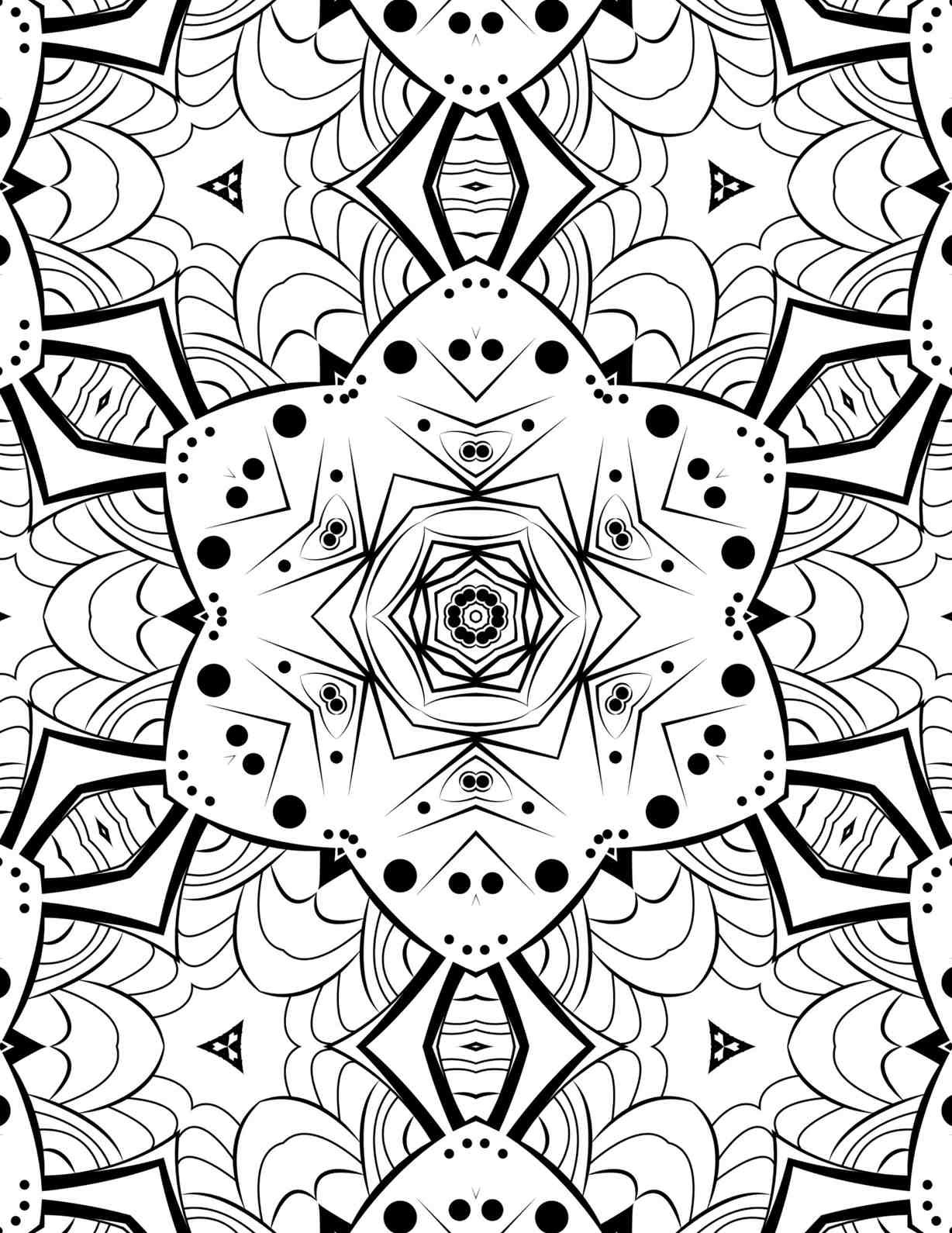 The “Geometric Harmony” mandala is a captivating study in structured beauty, presenting a series of meticulously layered shapes that draw the eye into its compelling depth. At its heart lies a precisely rendered star-like core, which then expands outwards through concentric layers, each adding new dimensions of detail. The design thoughtfully incorporates both sharp, angular elements and softer, rounded forms, creating a dynamic visual interplay. Bold, solid lines provide a strong framework, guiding the gaze through the various segments, while intricate dot patterns and delicate curved lines fill the interior spaces, offering subtle texture and visual interest. Surrounding the central motif, a fascinating array of repeating abstract shapes, some resembling stylized wings or arrows, contribute to the sense of continuous movement and expansion. The careful balance between positive and negative space, combined with the interplay of thick and thin lines, gives this mandala a unique architectural feel. It’s a design that feels both grounded in its symmetry and expansive in its intricate details, promising a deeply engaging experience.