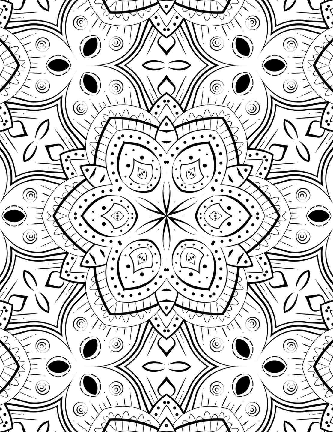 Intricate floral mandala with delicate petals and dot work, ideal for adult coloring and meditation.