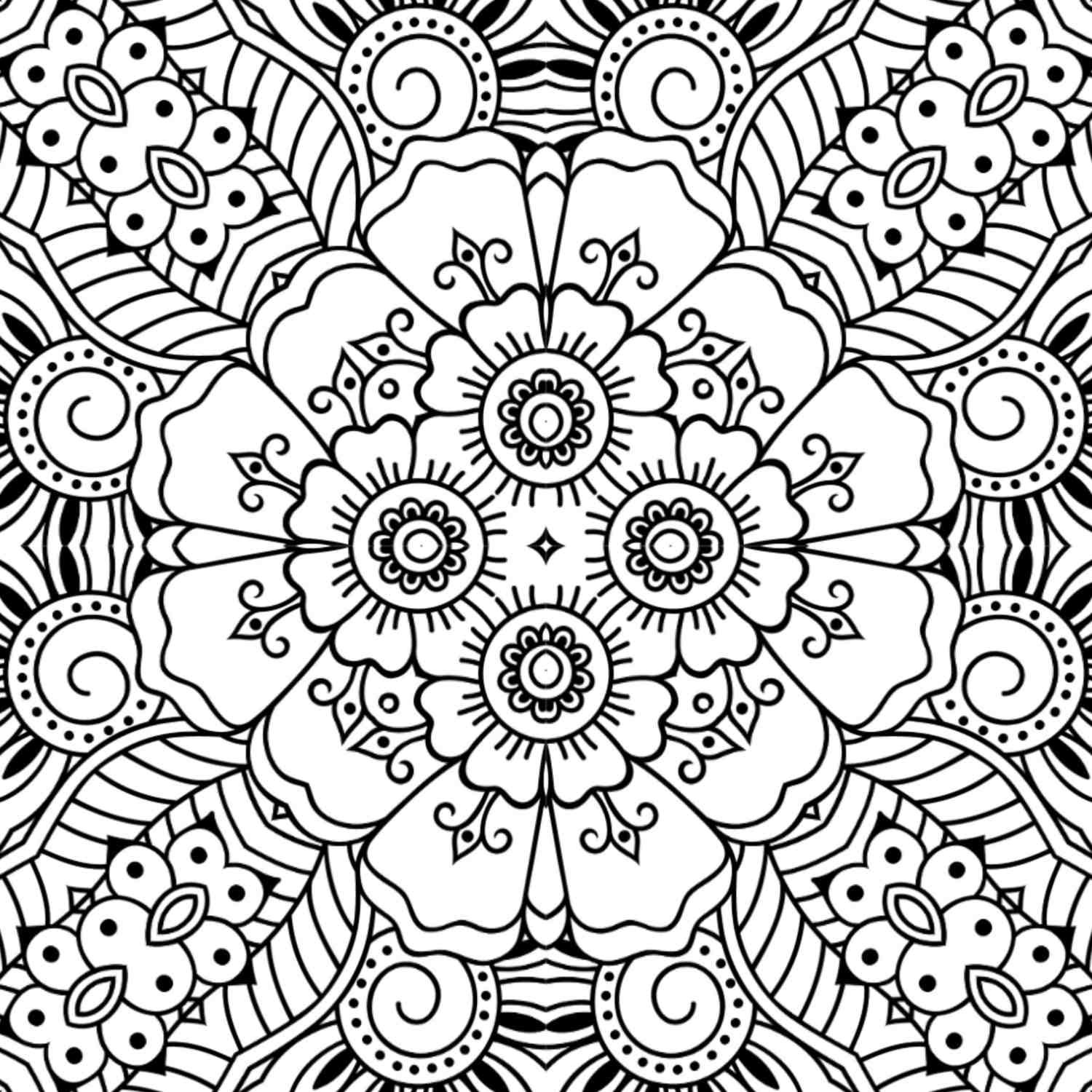 Step into a flourishing garden of artistic delight with our “Vibrant Blossom Mandala,” a design that celebrates the timeless beauty of floral symmetry. This captivating square mandala draws you in with its bold central motif, featuring a cluster of four perfectly formed flowers, each radiating outward from a subtle star-like core. These central blooms are intricately detailed with layered petals and distinct stamens, inviting a burst of color. Framing these prominent flowers are larger, gracefully expanding petals that fill the central quadrants, creating a sense of abundant growth and natural elegance. The outer edges and corners of the mandala are adorned with a rich array of classical elements: delicate scrolls, symmetrical leaf patterns, and small, ornate floral clusters. The interplay of open, expansive floral forms with more intricate, tightly packed details creates a dynamic balance, offering both ease for broader coloring and satisfying challenges for meticulous strokes. This mandala truly embodies the joy of nature’s blossoming beauty, presented in a harmonious and engaging pattern.
